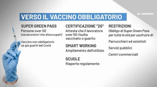 Obbligo vaccinale per gli over 60 e super Green Pass per tutti i lavoratori. Obbligo vaccinale per tutti gli over 50 estensione del green pass semplice a estetisti barbieri parrucchieri agli uffici pubblici postali e bancari e a numerose attività commerciali.